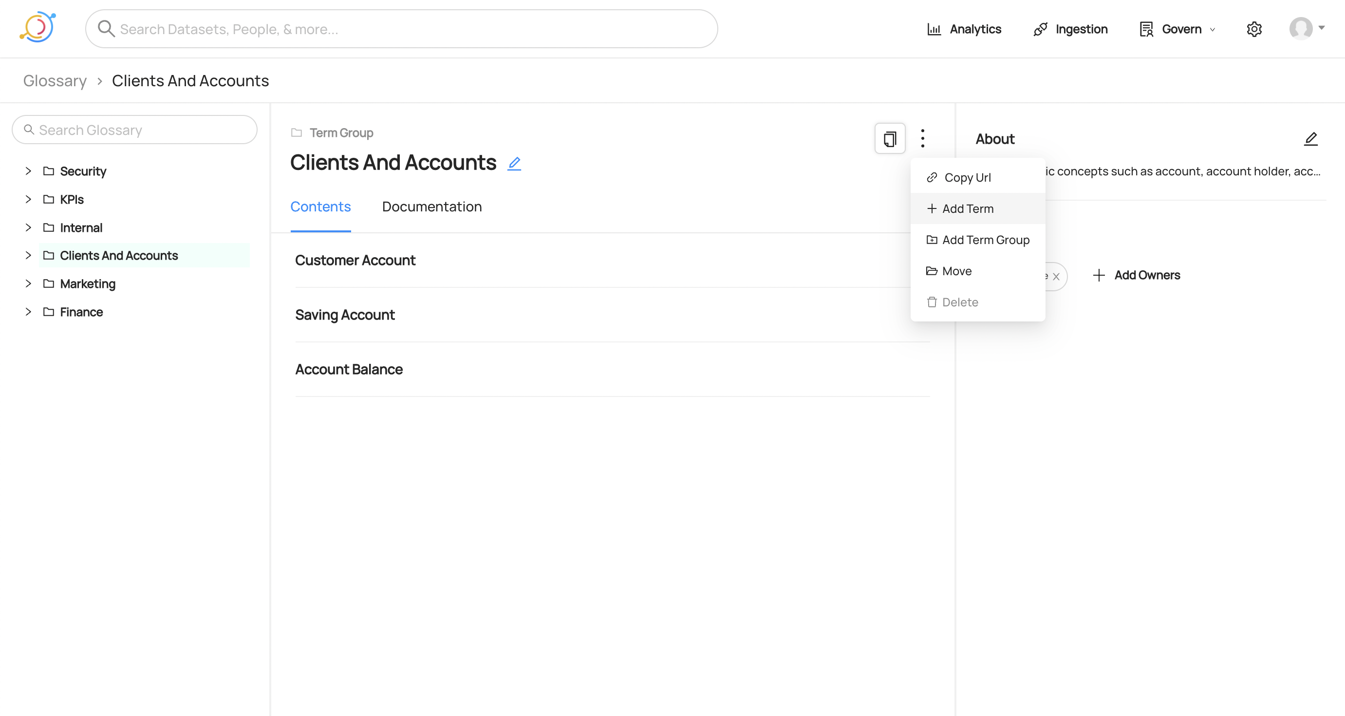 Both Terms and Term Groups allow you to add documentation and unique owners.