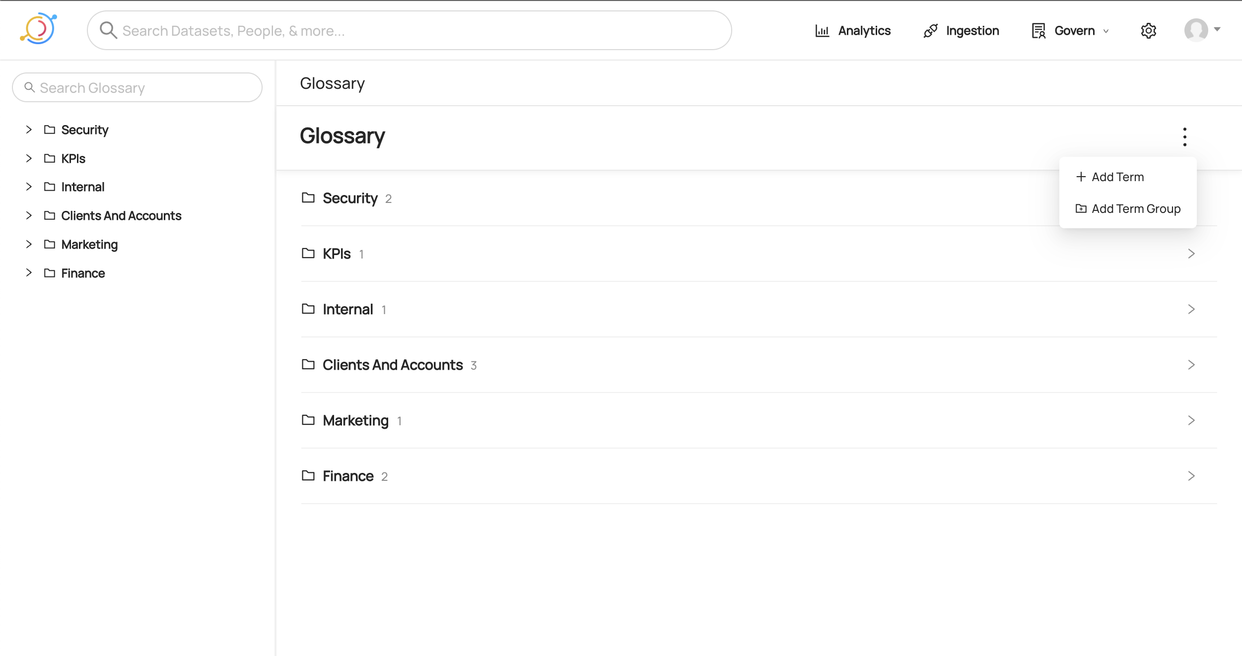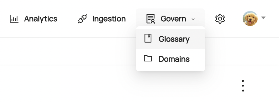 Once granted this privilege, you can access your Glossary by clicking the dropdown at the top of the page called Govern and then click Glossary:
