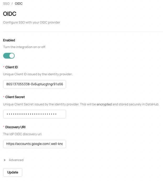 - Enter the Client ID, Client Secret, and Discovery URI obtained in the previous steps